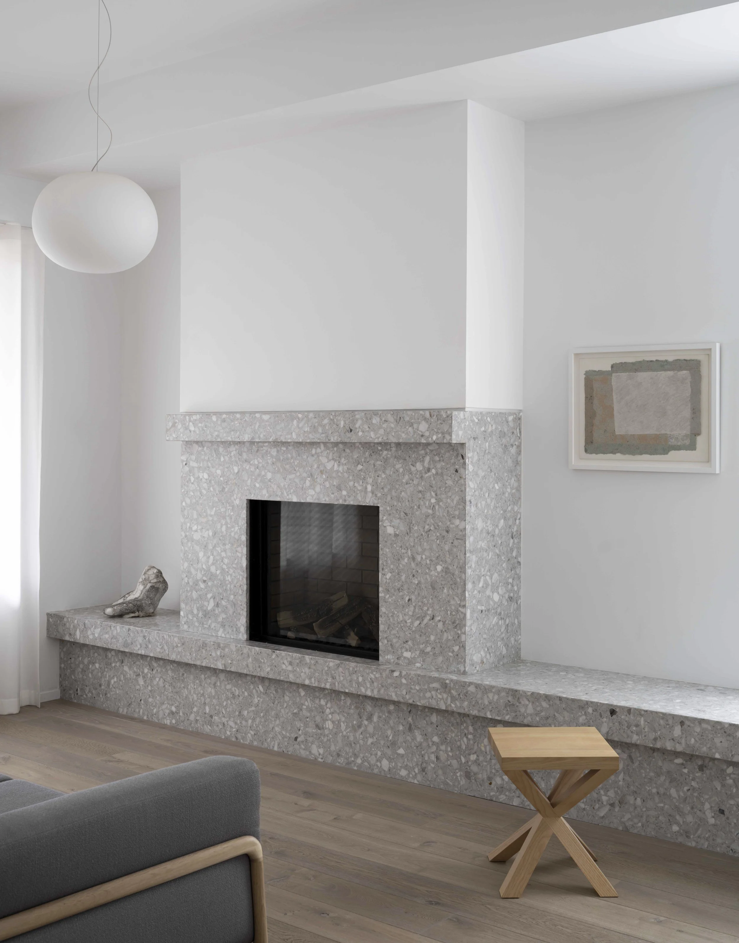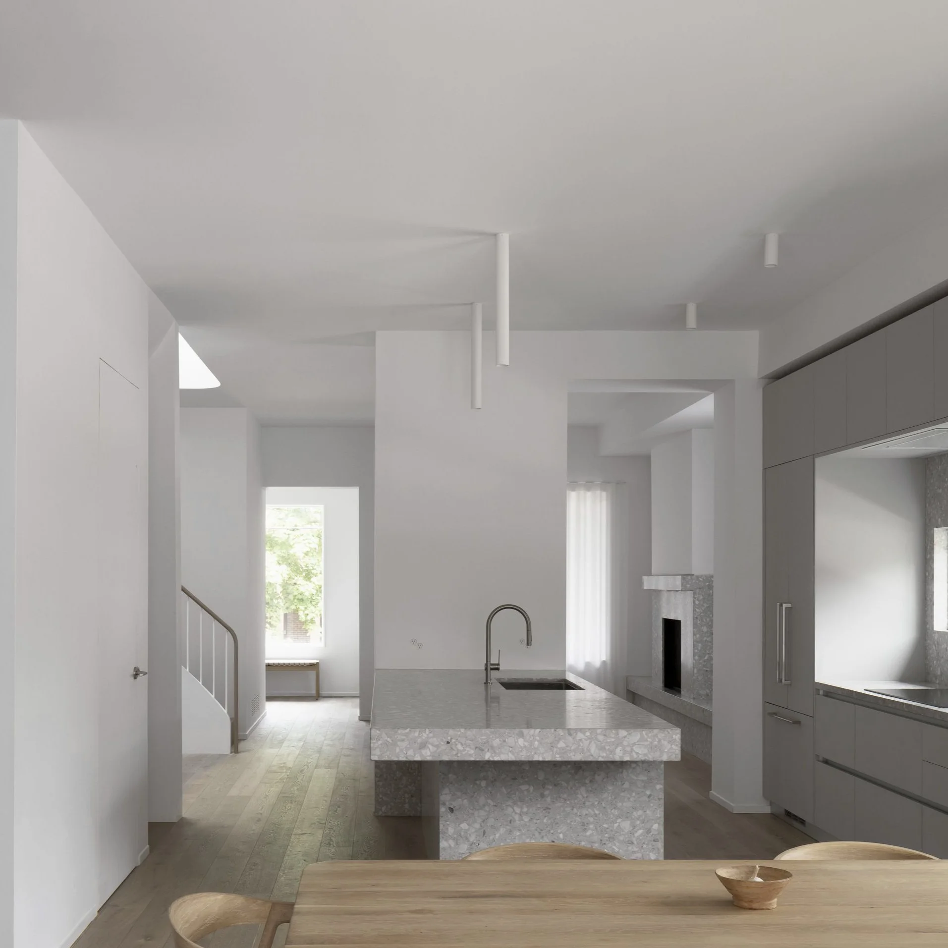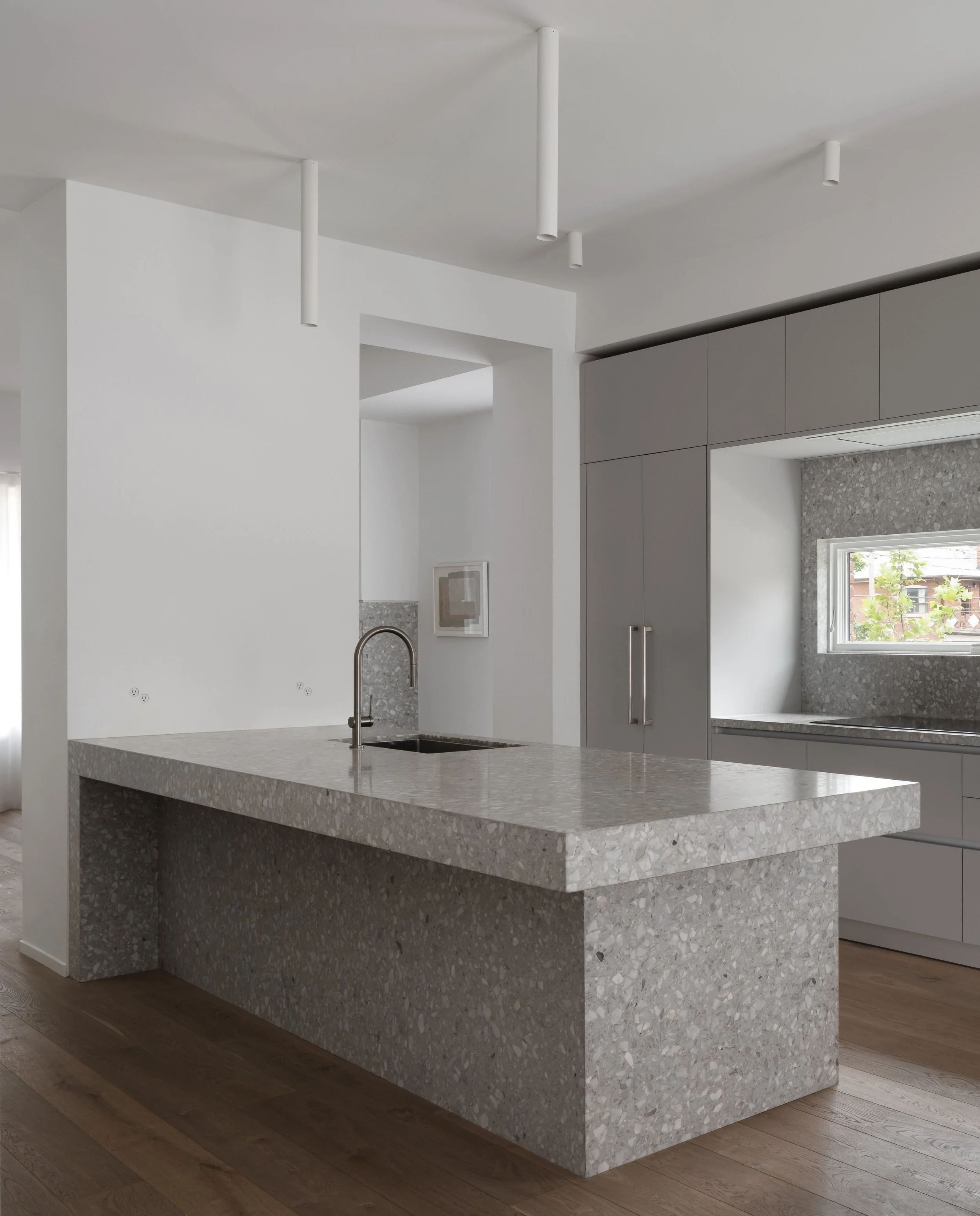The ground floor features a semi-open plan with a compact living room with fireplace at the west end, a dining and pantry area to the east, and the kitchen at the centre. Three terrazzo elements of the same thickness, one in each of these three spaces (the fireplace and associated bench, the kitchen island, and the pantry counter) are the focal point of each space and introduce a consistent, unifying material motif throughout the ground floor. House-wide, the interior material palette consists of natural wood, white and grey terrazzo, and muted colors, in contrast with the more vibrant and textured exterior brick façade. The second floor of the house features two bedrooms, a walk-in closet, an office, and two washrooms. The basement houses a separate living space for extended family.